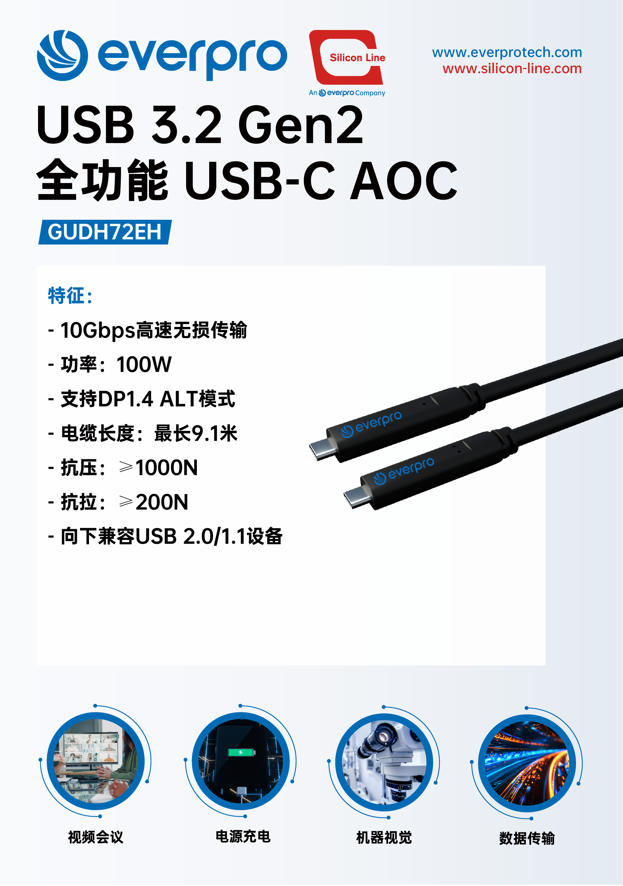 100W USB3.2 Gen2全功能USB-C有源光纜,支持9.1米長距離傳輸,向下兼容USB 2.0/1.1設(shè)備,具備超強(qiáng)抗壓抗拉性能,確保穩(wěn)定可靠的連接體驗(yàn)。